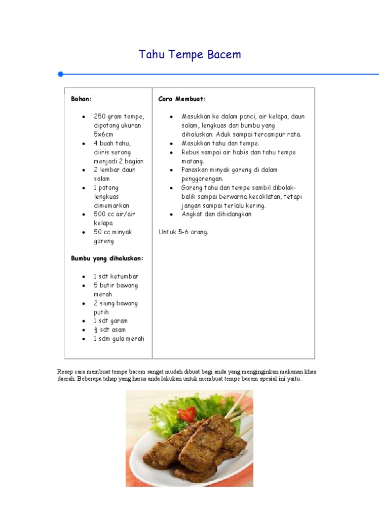 6 varian resep tempe bacem cocok untuk menu makan keluarga. Resep menarik lainnya. Sebagai salah satu makanan sehat yang mengandung banyak vitamin dan gizi berupa protein nabati tahu sangat sehat jika dikonsumsi secara teratur.