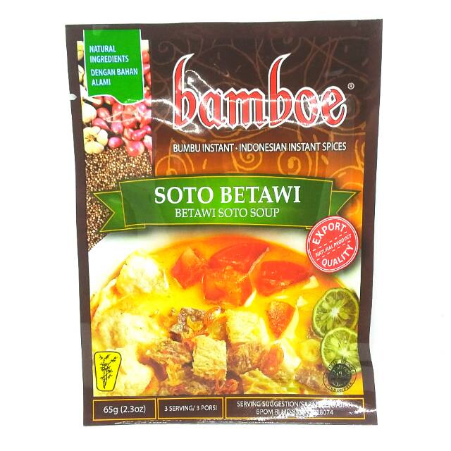 BAMBOE BUMBU SOTO BETAWI 65 GRAM Rp5900. Bango bumbu kuliner nusantara untuk membuat soto betawi khas jakarta yang mudah dan praktis terbuat dari bahan bahan pilihan. Rerempahan SOTO BETAWI Bumbu Jadi Instan Siap Pakai Berat netto 200gr Berat 300gr adalah berat packing Bumbu SIAP PAKAI yang terbuat dari bahan alami TANPA PENGAWET MSG.
